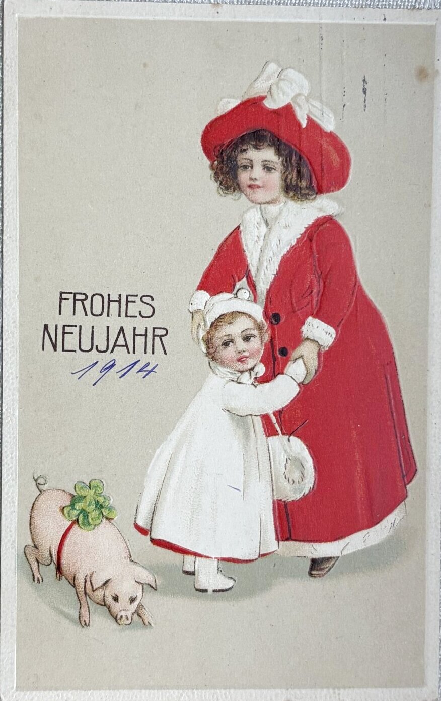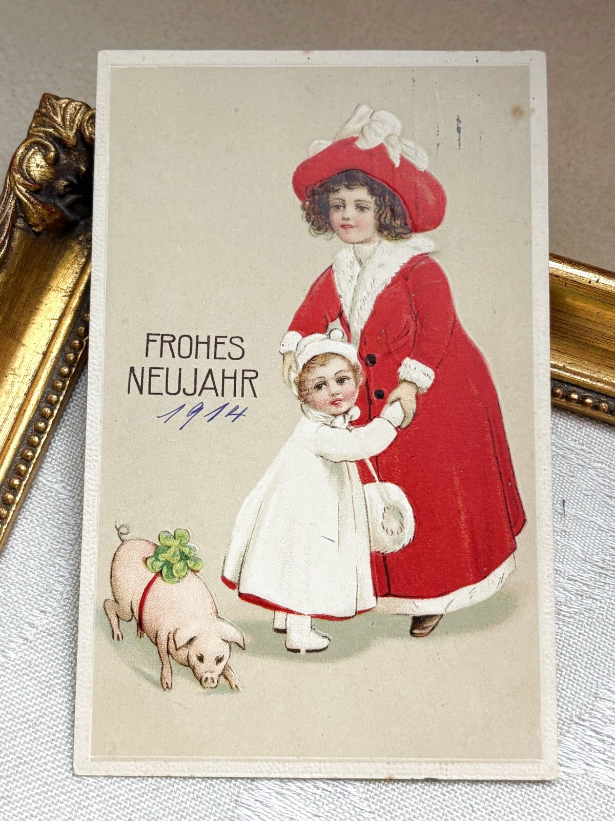 Postcard アンティークポストカード 新年祝い New Year 女の子と子豚 四つ葉クローバー