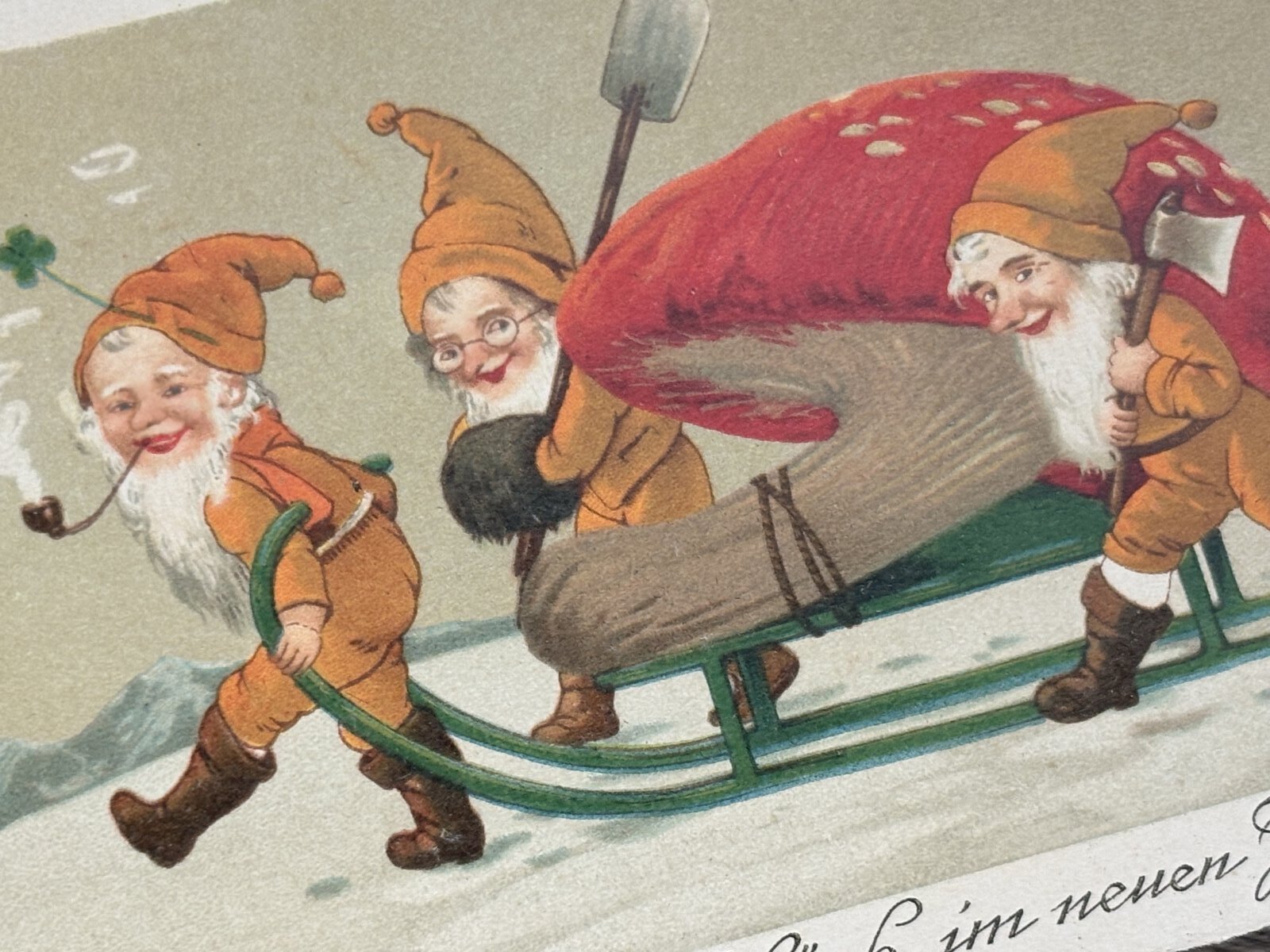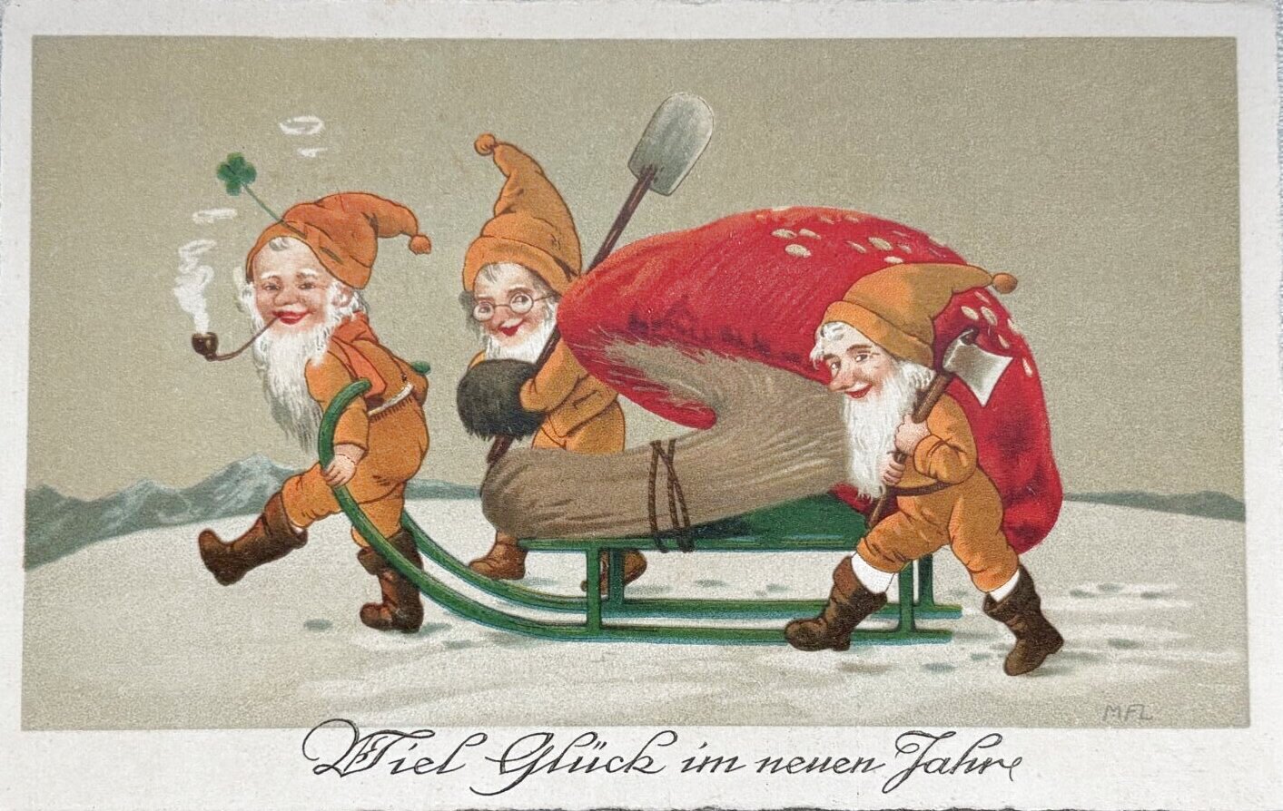 Postcard アンティークポストカード 新年祝い New Year キノコをソリで運ぶノーム妖精たち Marie Flatscher (未使用)