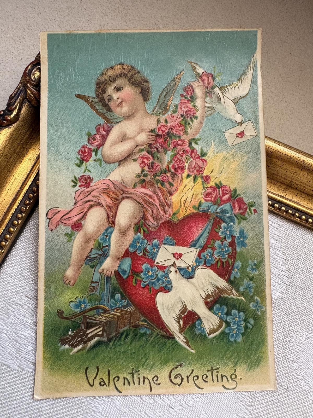 Postcard アンティークポストカード バレンタイン キューピッド天使 ハート 白鳩 薔薇