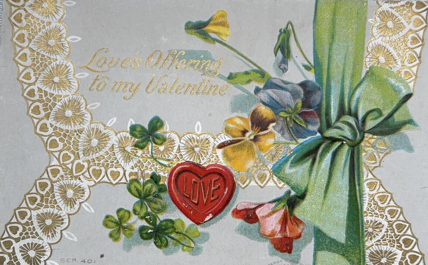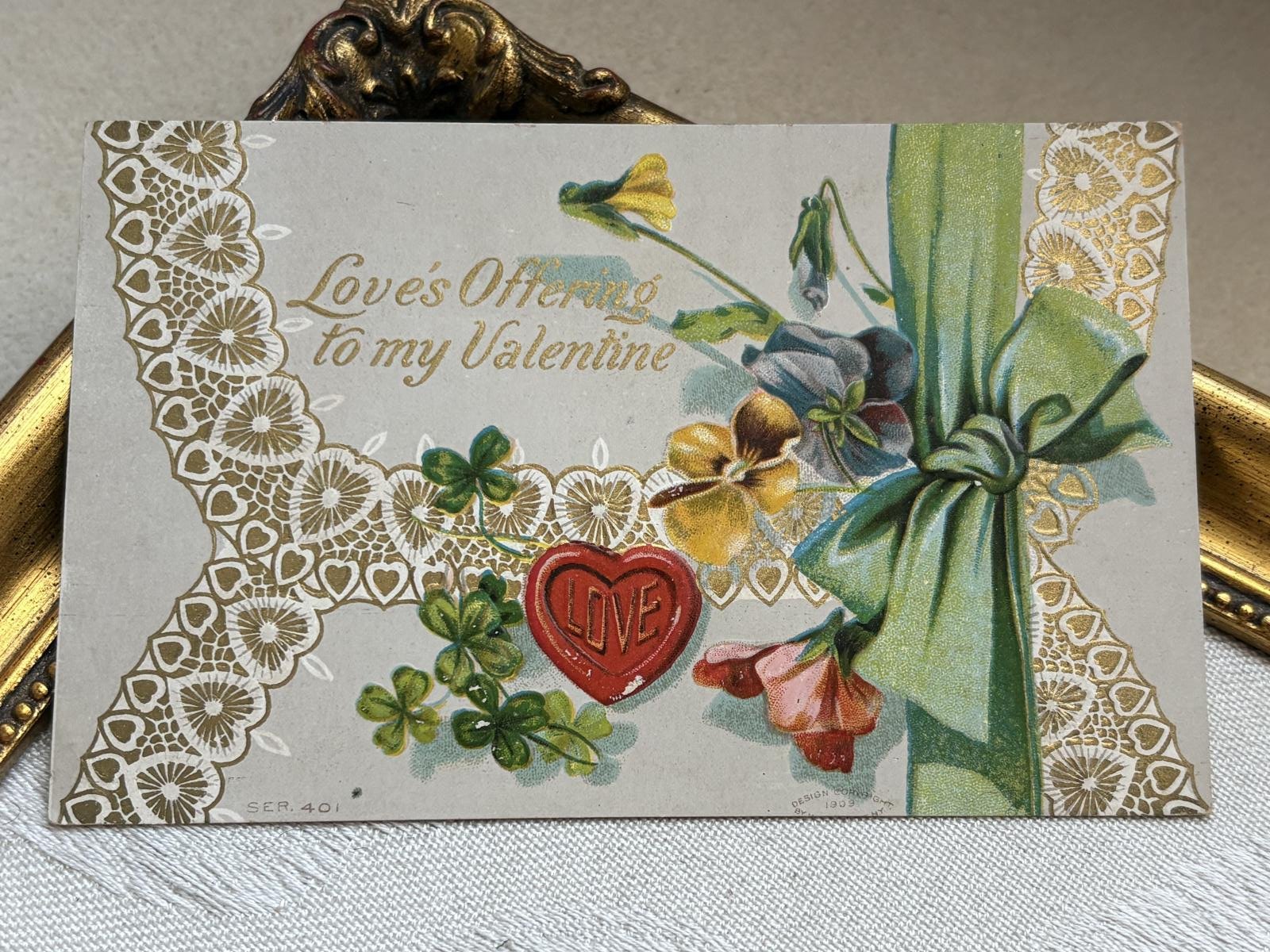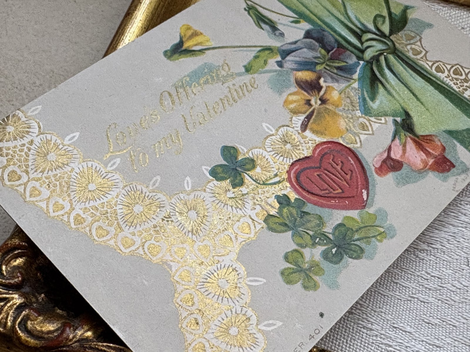 Postcard アンティークポストカード バレンタイン お花 リボン レース スミレ 四つ葉クローバー