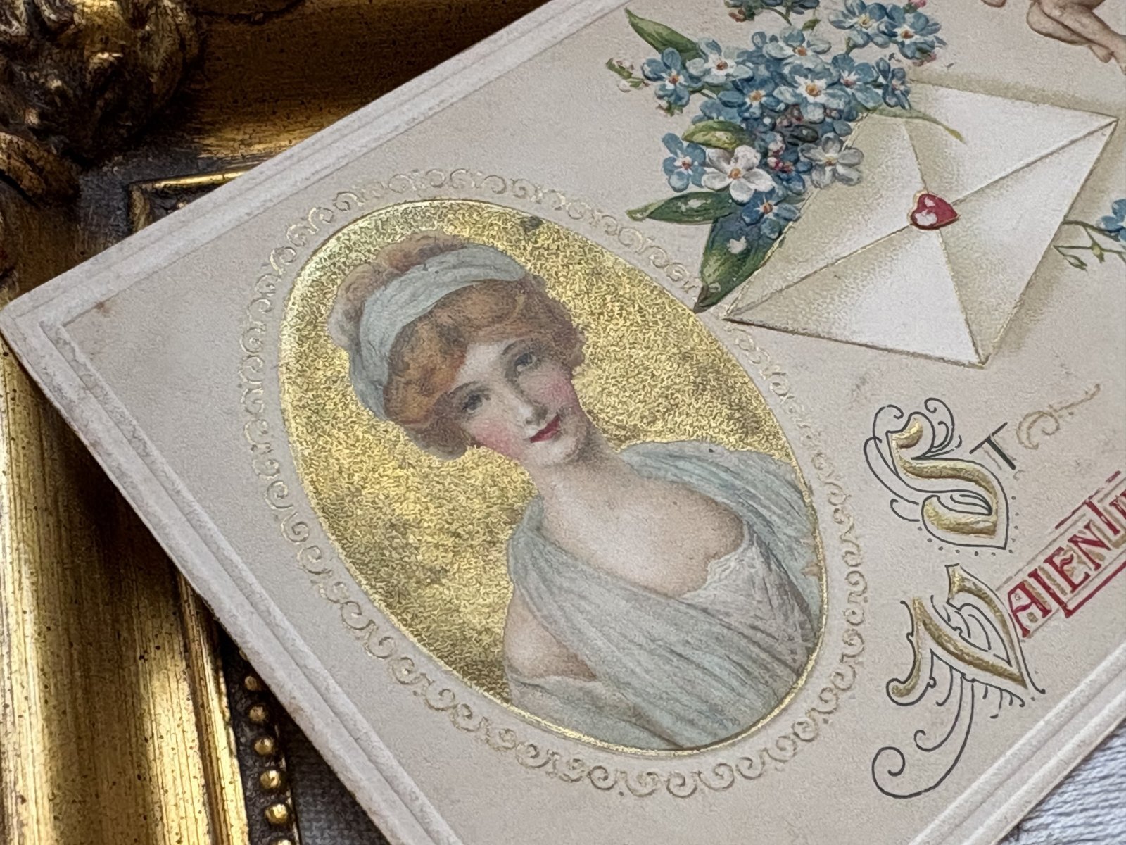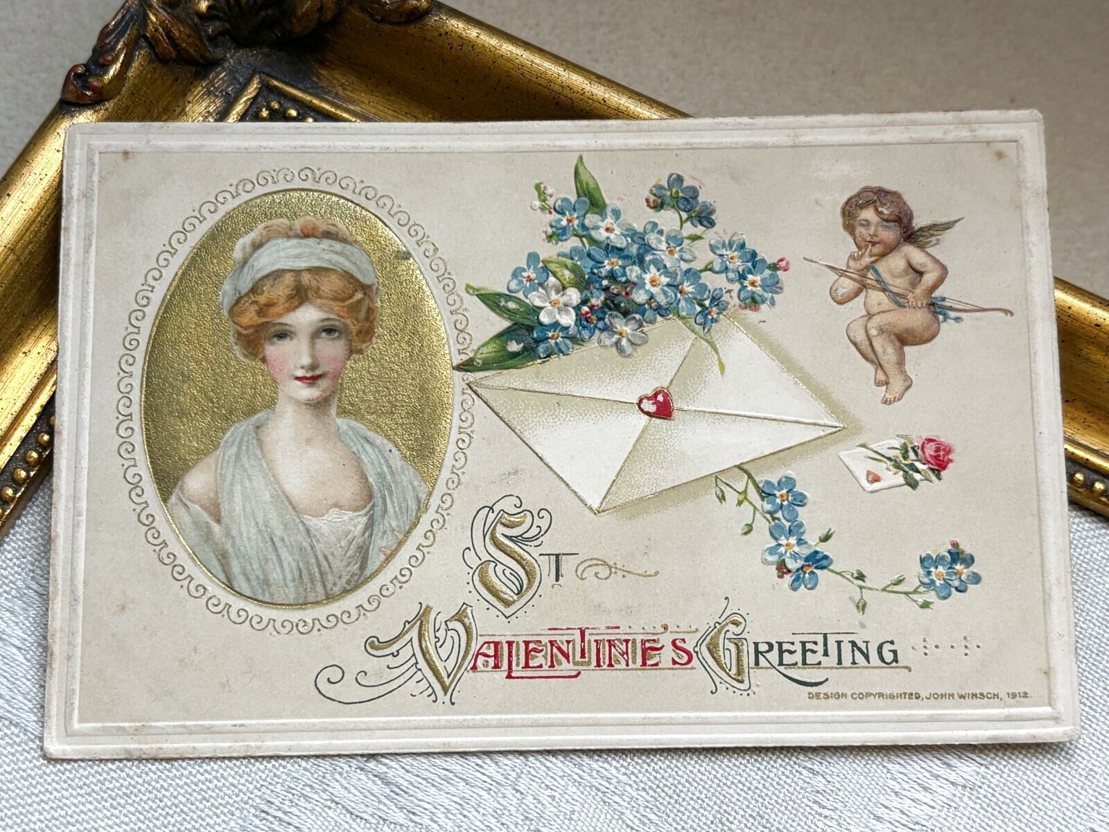 Postcard アンティークポストカード バレンタイン キューピッド天使と女性 手紙 忘れな草 [g12185]