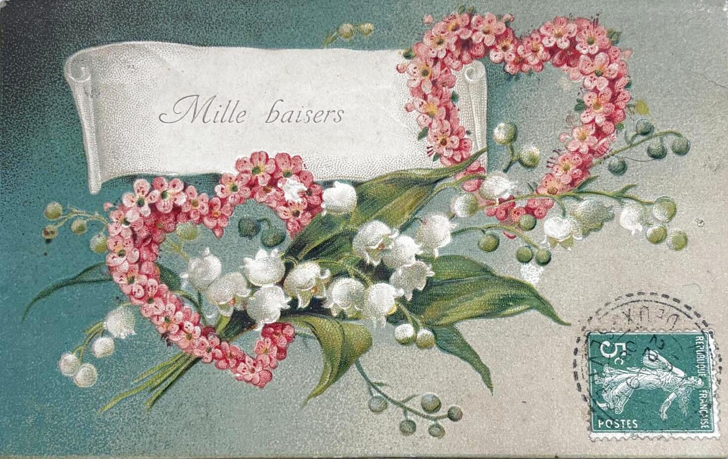 Postcard アンティークポストカード バレンタイン スズラン お花のリース フランス1908年