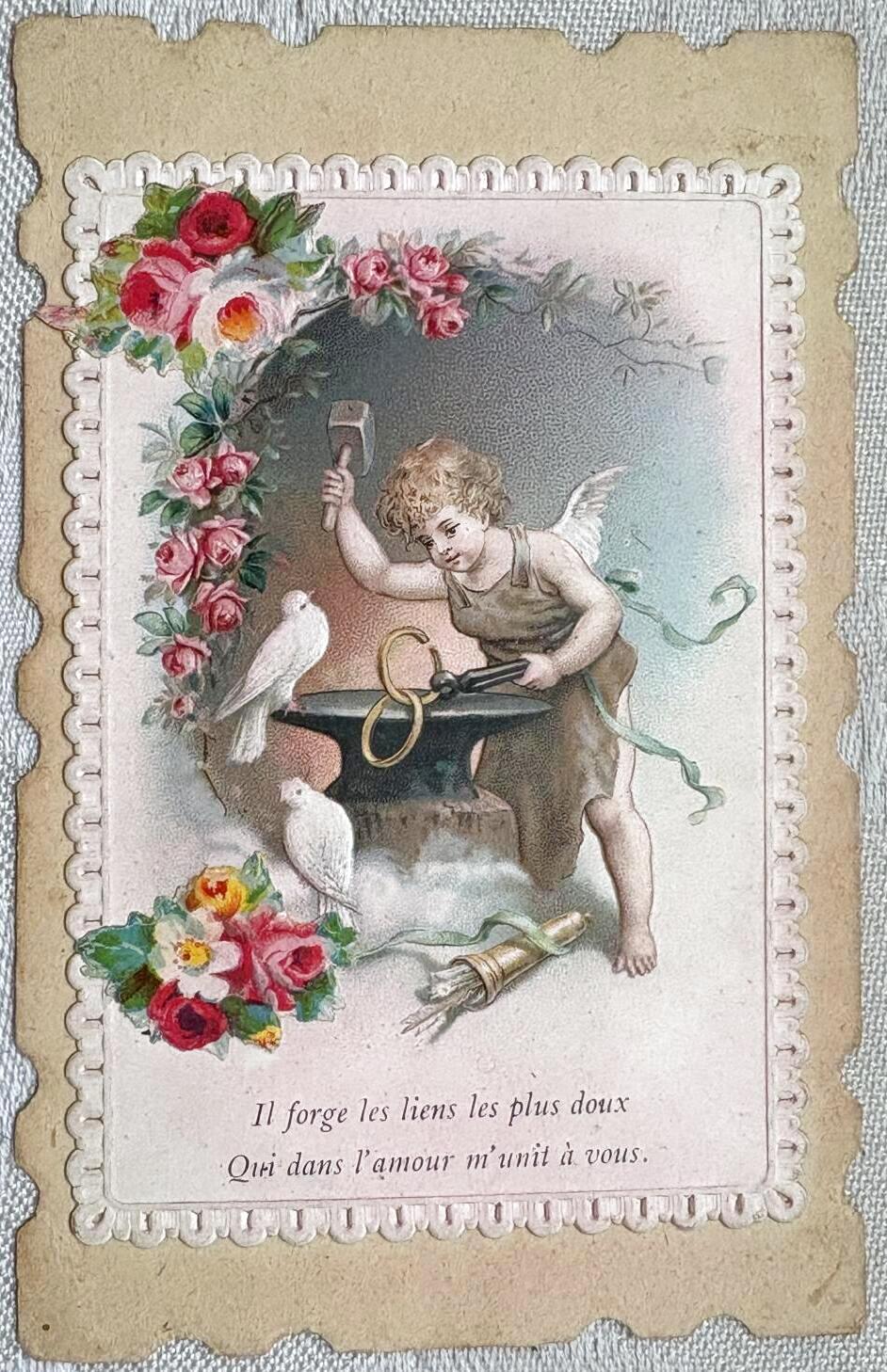 Postcard アンティークポストカード バレンタイン ペアリングを作るキューピッド天使の鍛冶屋さん 薔薇 結婚指輪 フランス (未使用) [g12188]