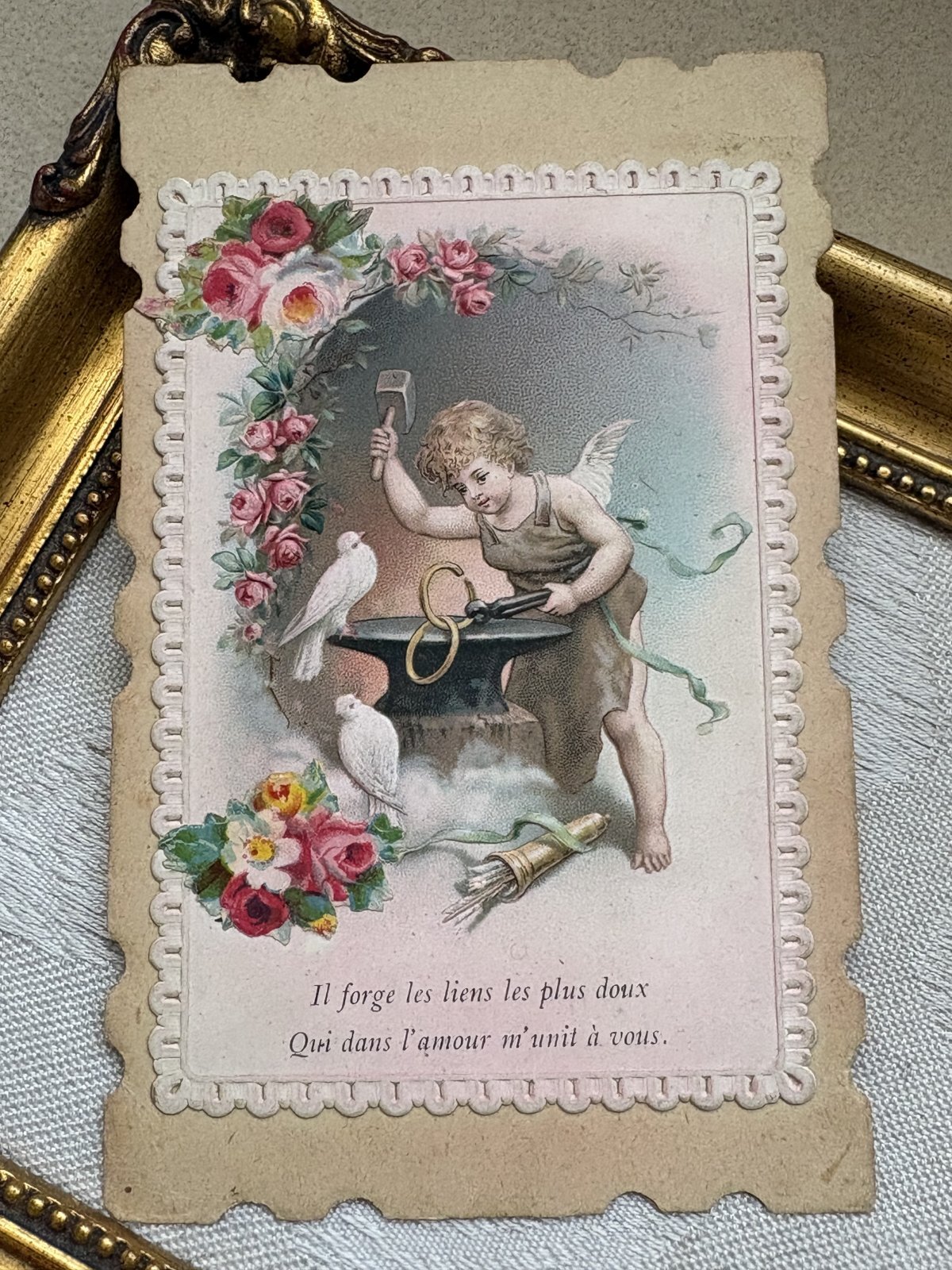 Postcard アンティークポストカード バレンタイン ペアリングを作るキューピッド天使の鍛冶屋さん 薔薇 結婚指輪 フランス (未使用)