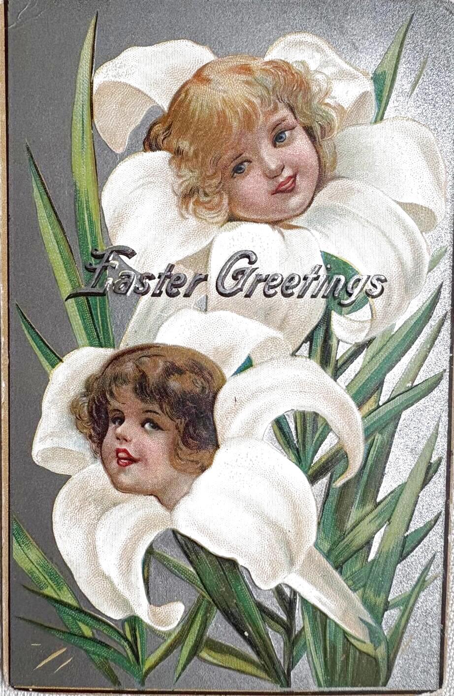 Postcard アンティークポストカード イースター 白百合のお花と子どもたち Frances Brundage 1911年