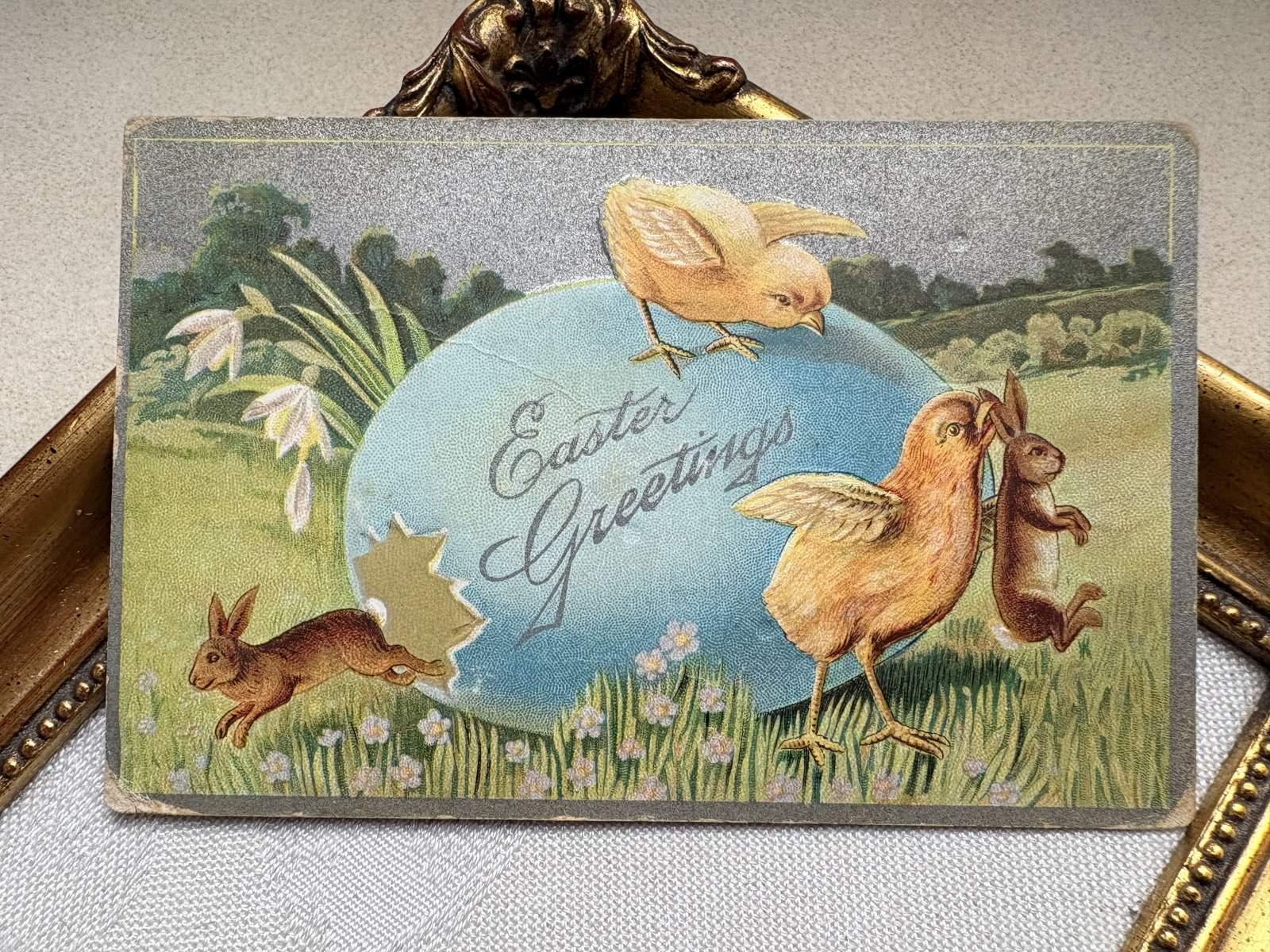 Postcard アンティークポストカード イースター ヒヨコにつまみ出されるウサギ うさぎ 卵 [g12223]
