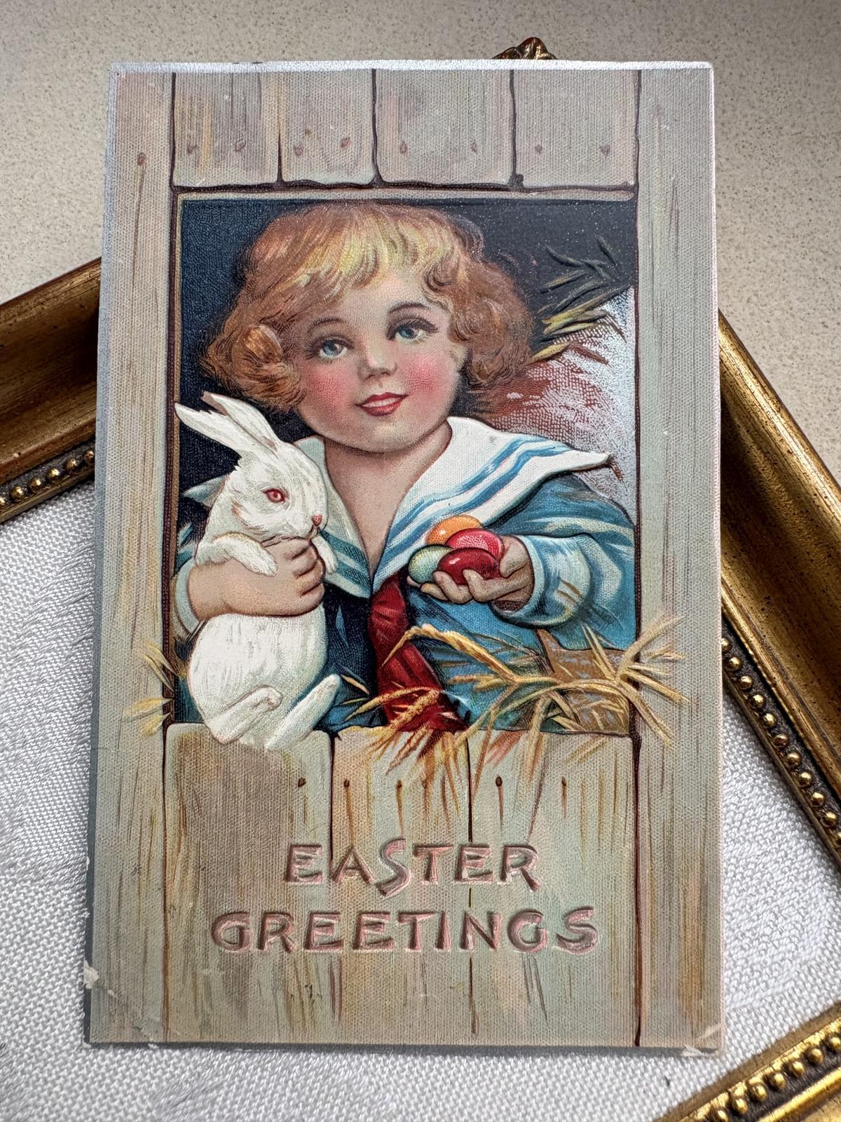 Postcard アンティークポストカード イースター ウサギとセーラー服の男の子 卵 うさぎ 兎 1909年