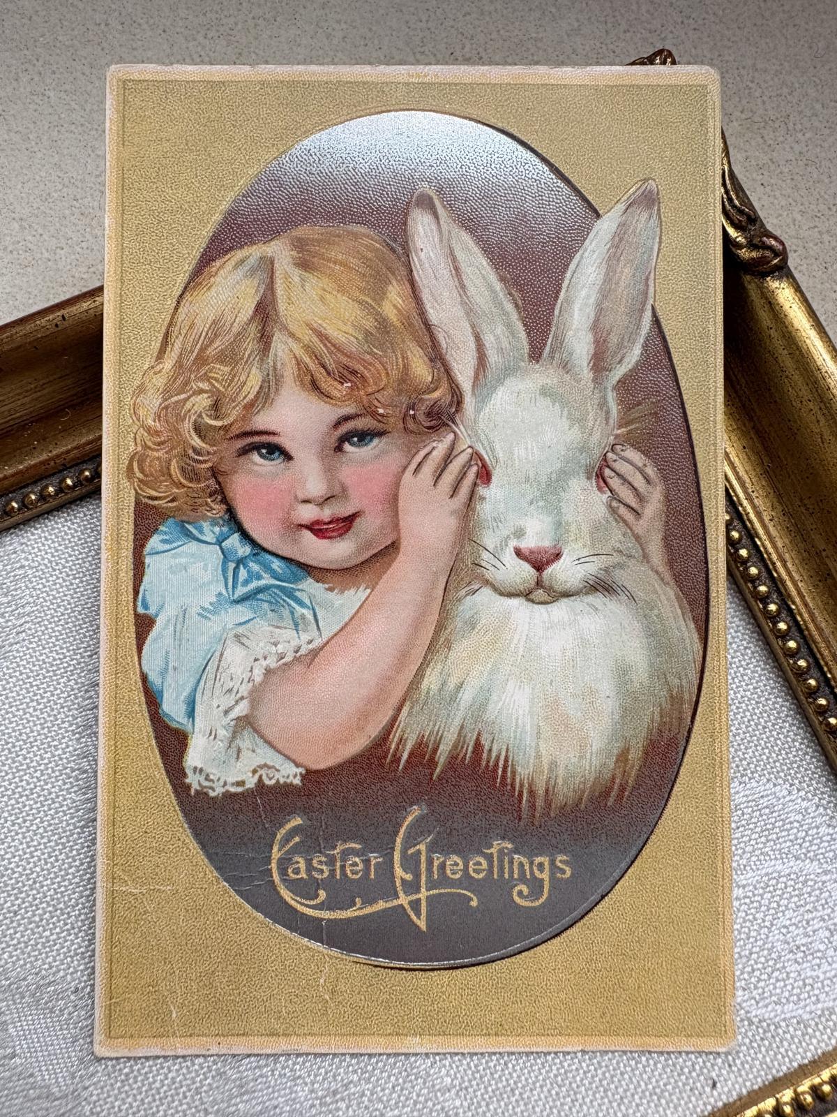Postcard アンティークポストカード イースター ウサギに目隠しをする女の子 卵 うさぎ 兎 1909年