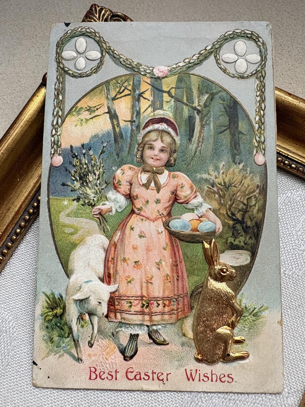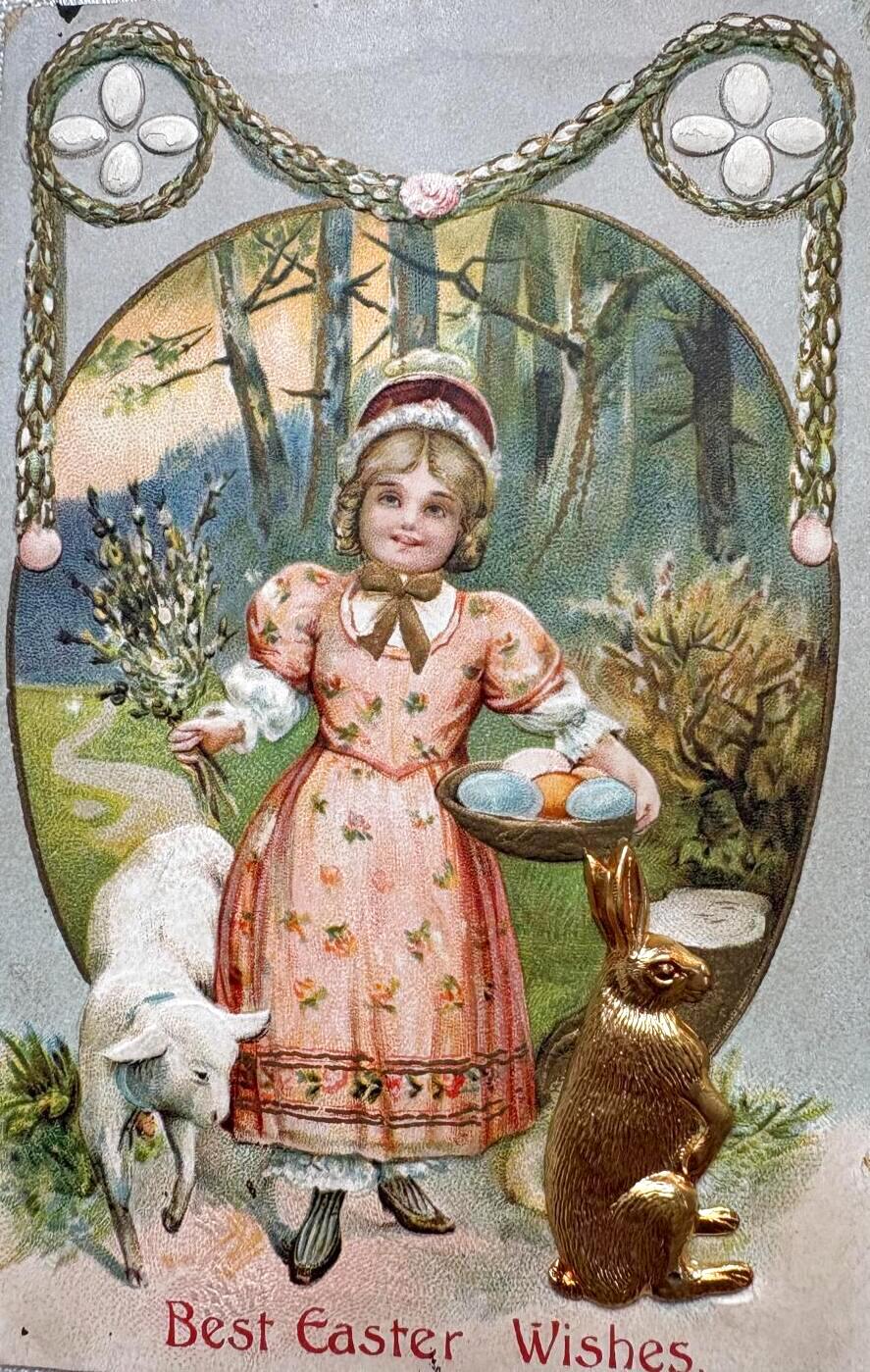 Postcard アンティークポストカード イースター ウサギと羊と女の子 卵 うさぎ 兎 メタル