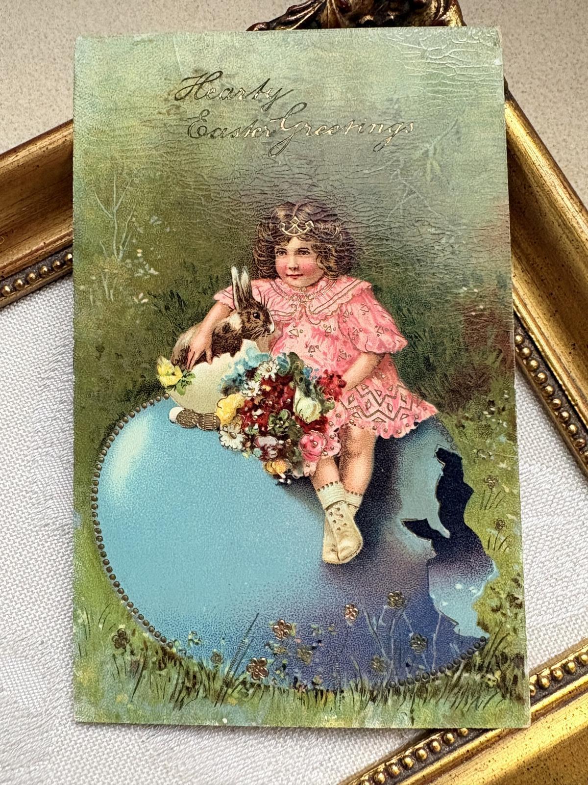 Postcard アンティークポストカード イースター 大きな卵とウサギと女の子 卵 うさぎ 兎 (未使用)