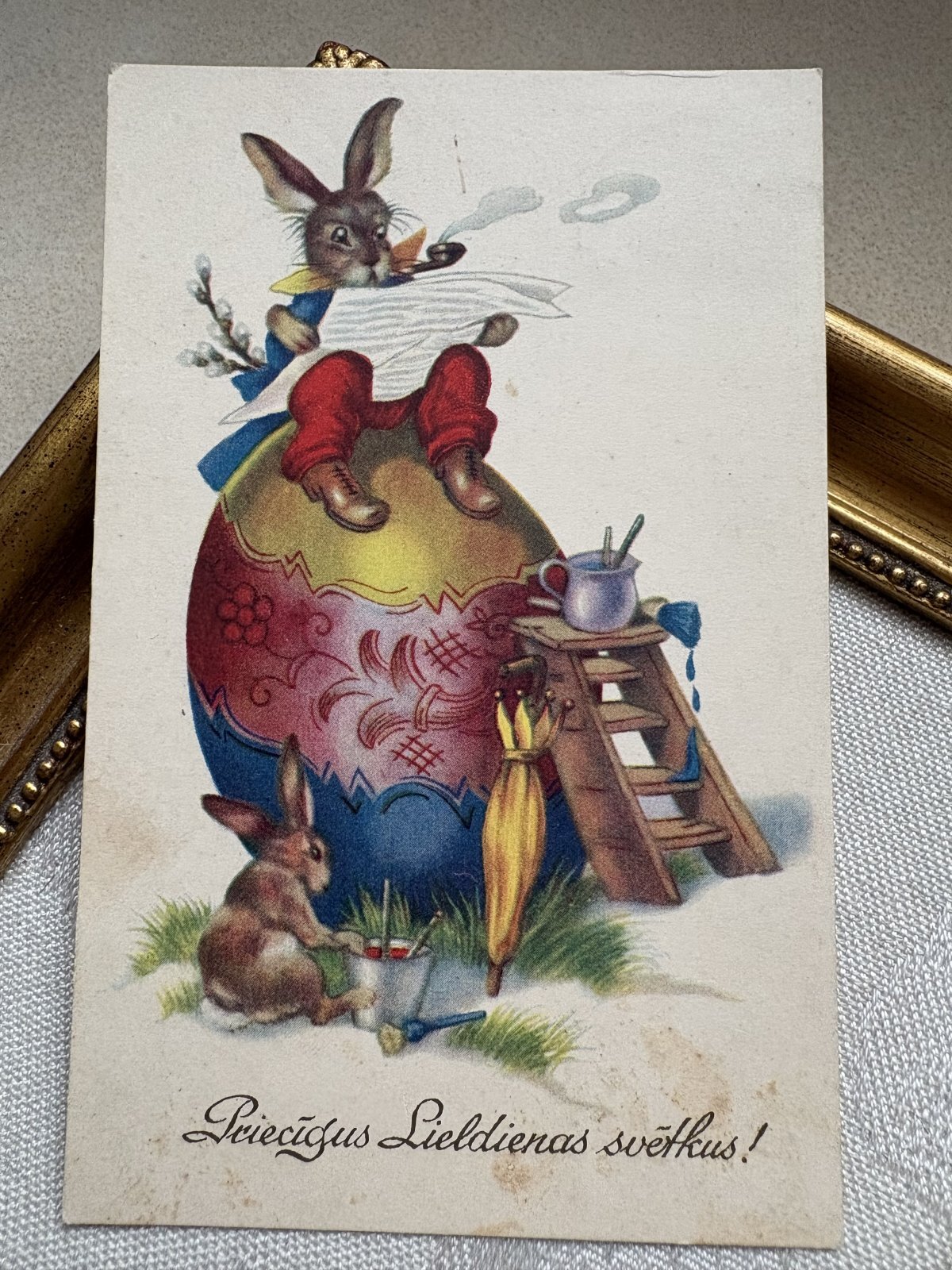 Postcard アンティークポストカード イースター 大きな卵の上で新聞を読むウサギさん ペイント 兎 うさぎ ドイツ1937年