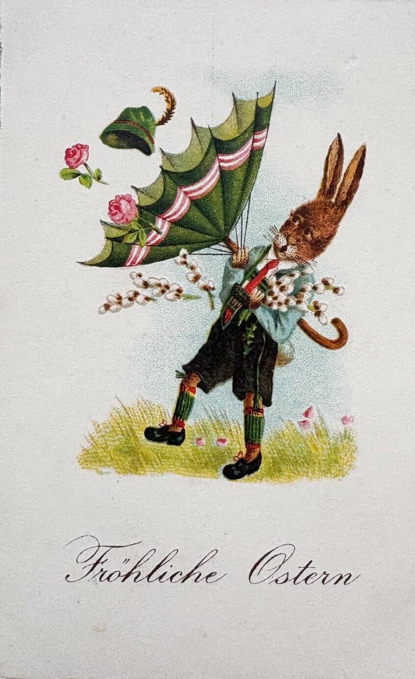 Postcard アンティークポストカード イースター 傘とウサギさん 兎 うさぎ (未使用)