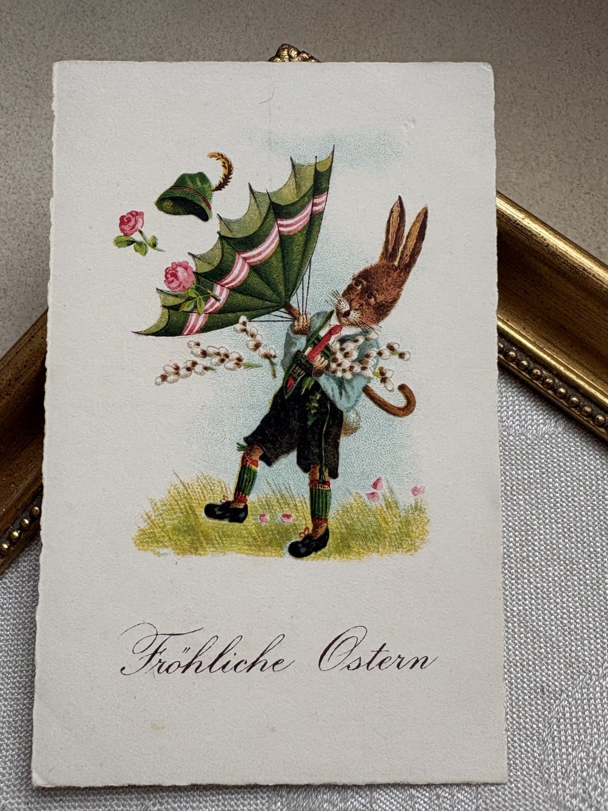 Postcard アンティークポストカード イースター 傘とウサギさん 兎 うさぎ (未使用) [g12262]