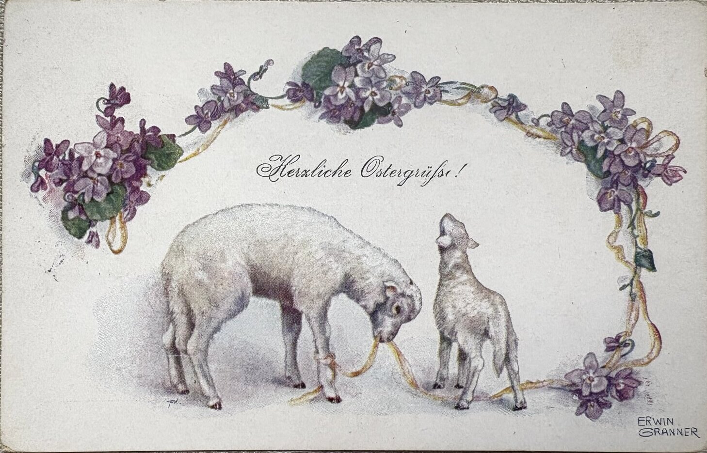 Postcard アンティークポストカード イースター 羊とスミレのお花 Erwin Granner オーストリア1920年